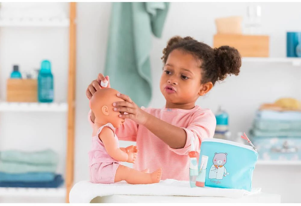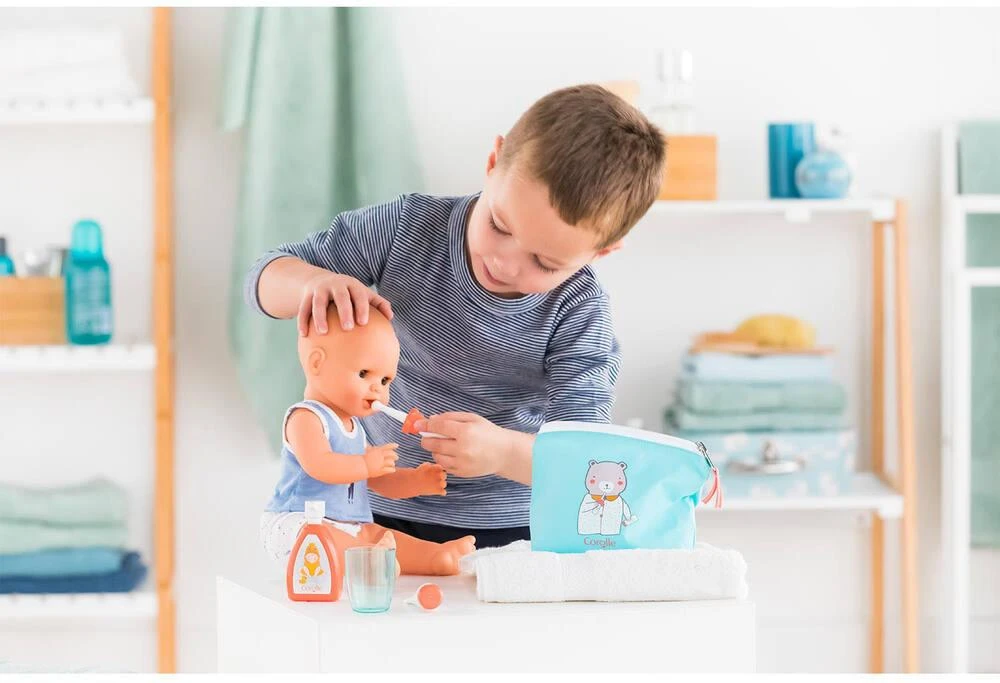 Avec la Trousse de Toilette et ses accessoires; l’enfant dispose de tout ce qu’il faut pour réaliser la toilette de son grand poupon de 36 à 42 cm et intégrer le rituel du brossage de dents : un lait de toilette; un tube de dentifrice; une brosse à dents électrique factice; un verre; ainsi qu’une jolie trousse de toilette pour tout ranger.