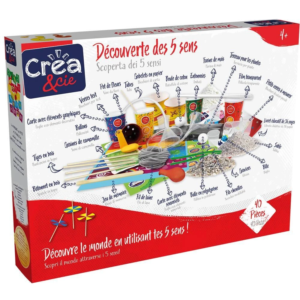 Des expĂ©riences Ă©tonnantes pour dĂ©couvrir le monde en utilisant tes 5 sens ! Initier l’enfant Ă la dĂ©couverte des 5 sens : le toucher, l’ouĂŻe, le goĂ»t, l’odorat et la vue. CrĂ©er un sac sensoriel pour dĂ©couvrir le toucher, Ă©tudier comment les sons voyagent, comment les yeux reconnaissent les couleurs, ressentir les odeurs et les goĂ»ts. 19 expĂ©riences ou activitĂ©s. 40 pièces. Contient : une carte avec Ă©lĂ©ments graphiques, une carte avec Ă©lĂ©ments sensoriels, du terreau pour les plantes, des gobelet en papier, une balle en polystyrène, un bâtonnet en bois, des verres test, des petits verres Ă mesurer, des graines de camomille, du film transparent, des tiges en bois, un pot de fleurs, une boule de coton, des ballons, un jeu de mĂ©moire, du sable, une bille, des entonnoirs, du fil de laine, des tubes, des graviers, des fils chenilles (ou fils Ă modeler), de la farine de maĂŻs et un livret Ă©ducatif illustrĂ© de 36 pages.