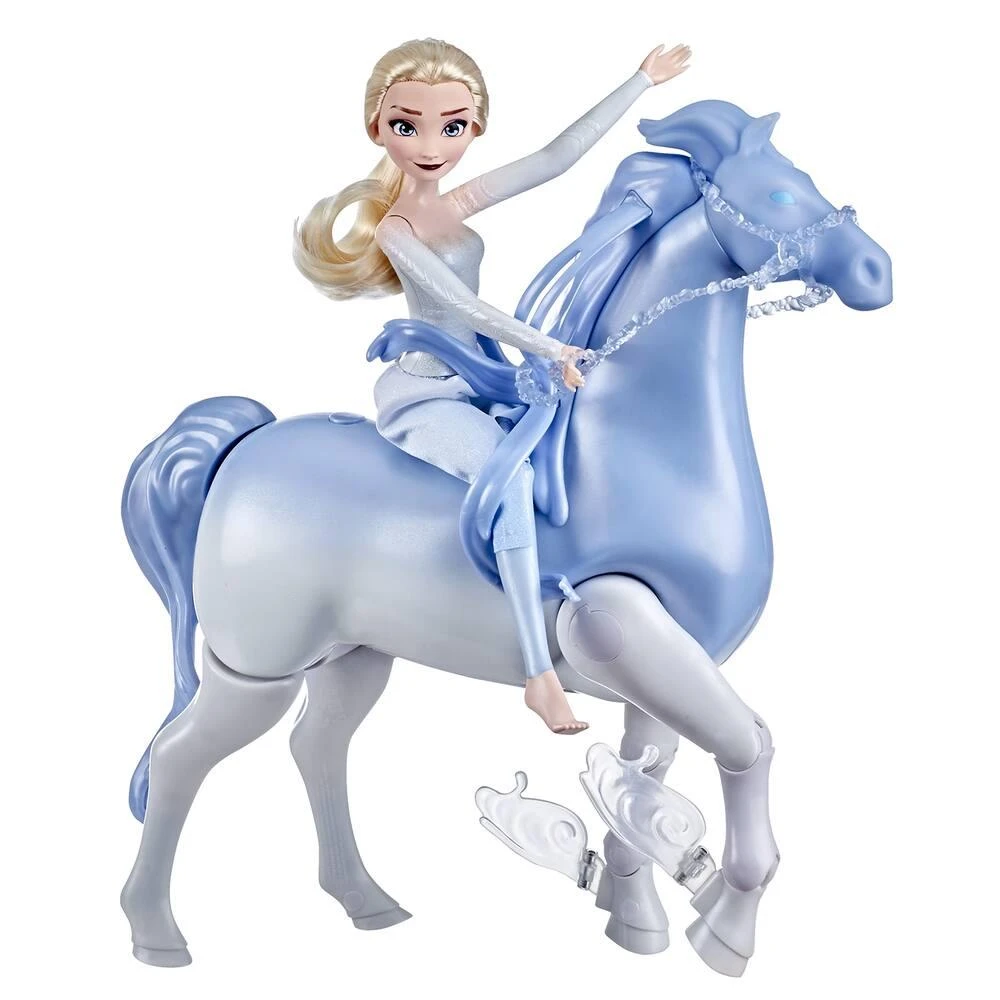 Dans la Reine des Neiges 2, Elsa, Anna, Kristoff et Olaf partent Ă l’aventure afin de sauver le royaume d’Arendelle qui est envahit par les 5 forces de la nature. Ils se rendent dans la forĂŞt enchantĂ©e oĂą ils vont dĂ©couvrir de nombreux nouveaux personnages. Elsa va devoir replonger dans les souvenirs du passĂ© dans le but de dĂ©couvrir l’histoire entre le peuple de Northuldra et les soldats d’Arendelle et comprendre le mystère de la forĂŞt enchantĂ©e. Poupee Princesse Disney Elsa 30 cm et son cheval Nokk interactif 23 cm Nokk est accompagnĂ© d’accessoires. 7 points d’articulation.