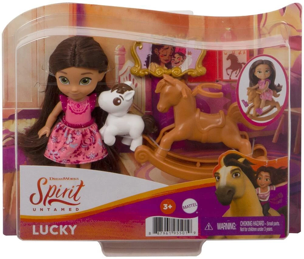 Lucky mesure 14cm de hauteur. La poupée articulée en 5 points porte de longs cheveux à coiffer, une jupette rouge en tissu et un top moulé. Elle est associée à 5 accessoires.