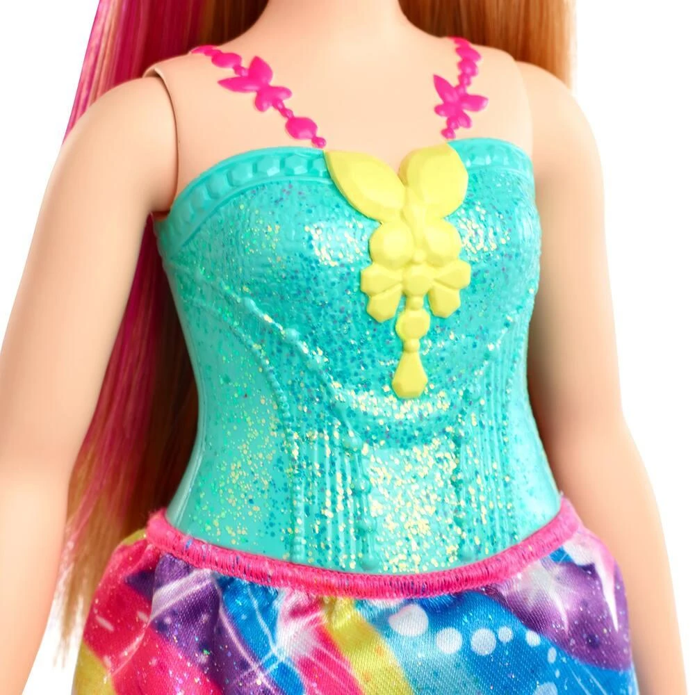 Avec leurs looks féériques aux détails colorés, les princesses Barbie Dreamtopia vous transportent dans un monde magique où les rêves deviennent réalité ! Cette Barbie princesse arbore une tenue digne des grandes réceptions royales avec un bustier bleu pailleté et une jupe arc-en-ciel. Une mèche rose vient rehausser ses cheveux blonds d’une jolie touche de couleur, tandis que le diadème donne encore plus d’éclat à son look.