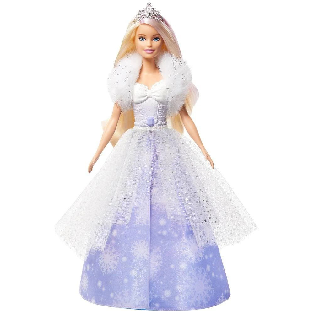 La princesse Barbie est vêtue d’une longue robe pailletée couleur lavande dont le jupon s’évase en éventail par simple pression. Un florilège de motifs aux couleurs froides et nuancées est ainsi dévoilé pour évoquer la magie de l’hiver.