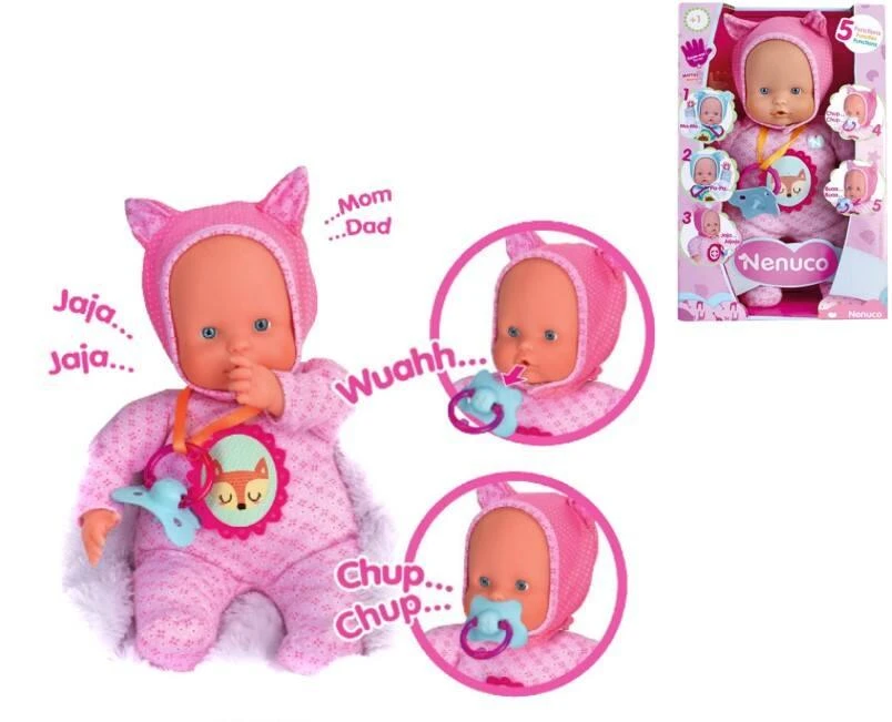 Nenuco 5 fonctions est un poupon au corps souple. Il a un pyjama rose tout mignon avec des oreilles de chats!